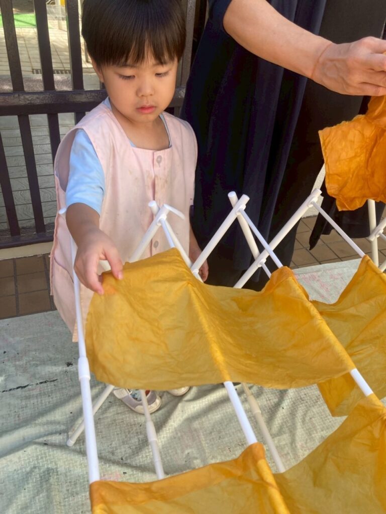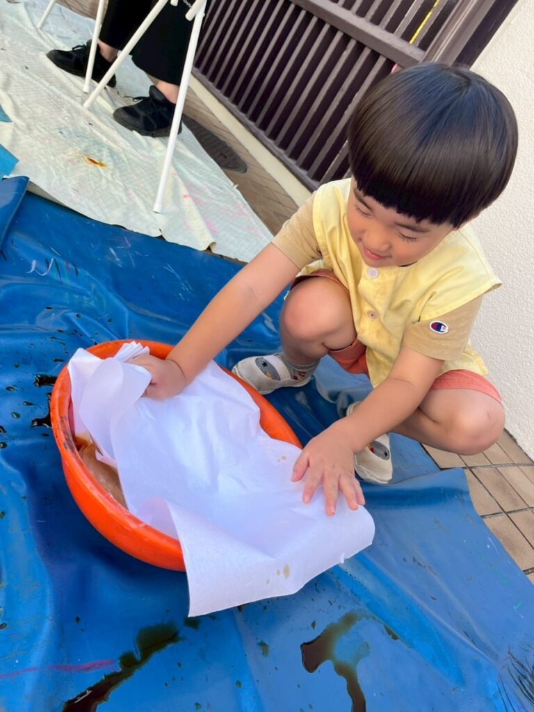 「ぺたぺた~♪」と和紙をちぎって、のりで貼っていきます。