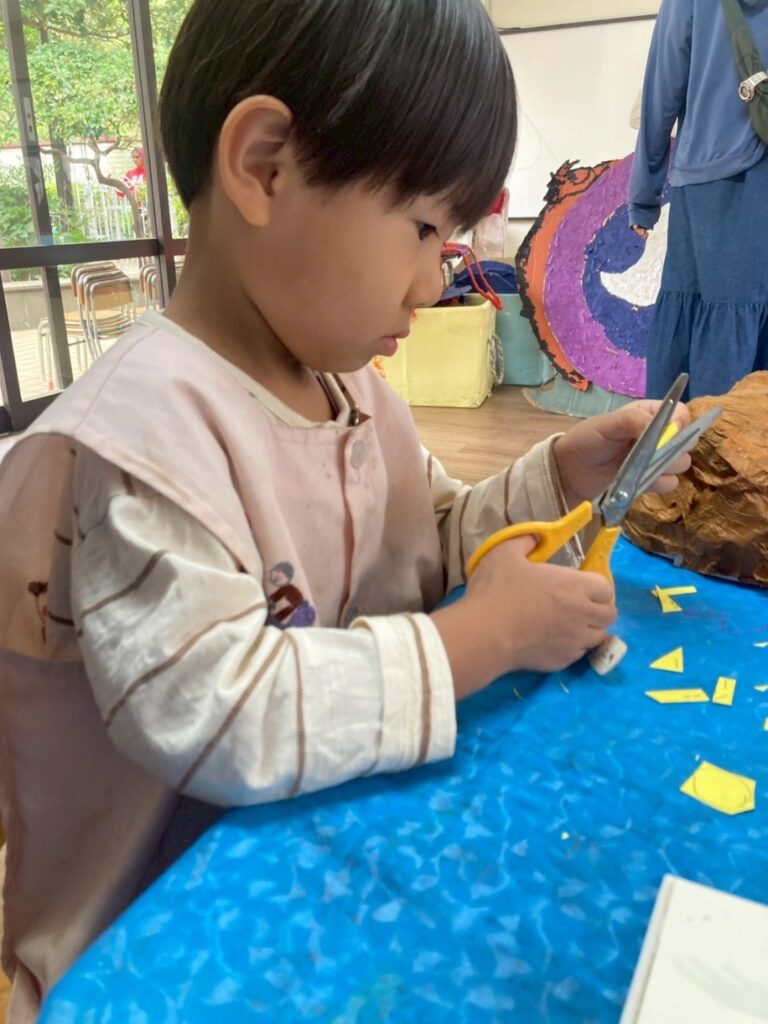 「びりびり~!」と新聞紙をちぎって、貼っていきます。