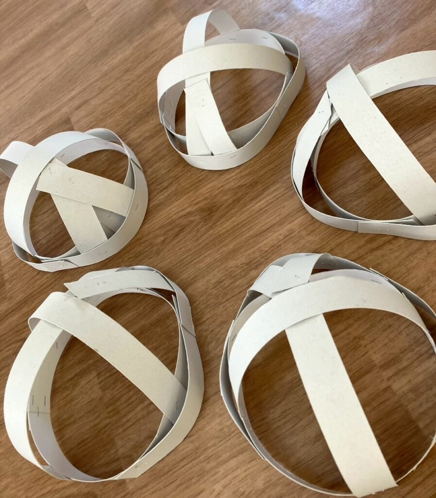 まずは、ひとりひとりの頭のサイズを計り、お面の枠組みを作ります。