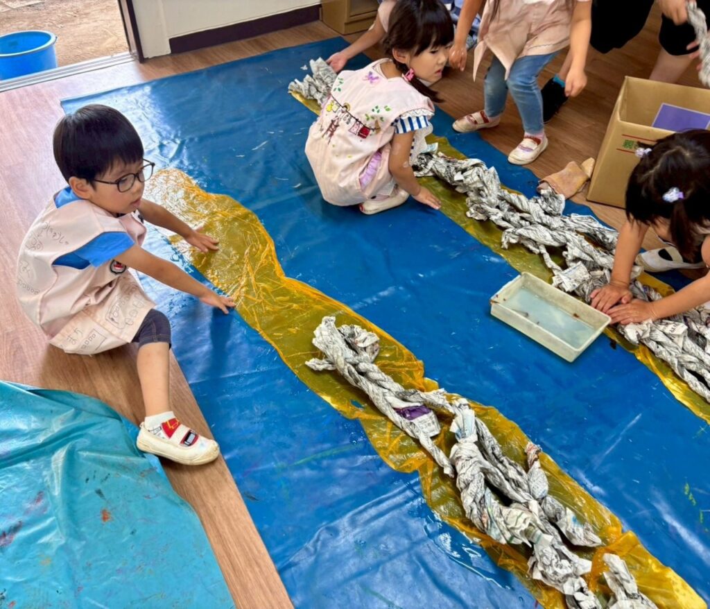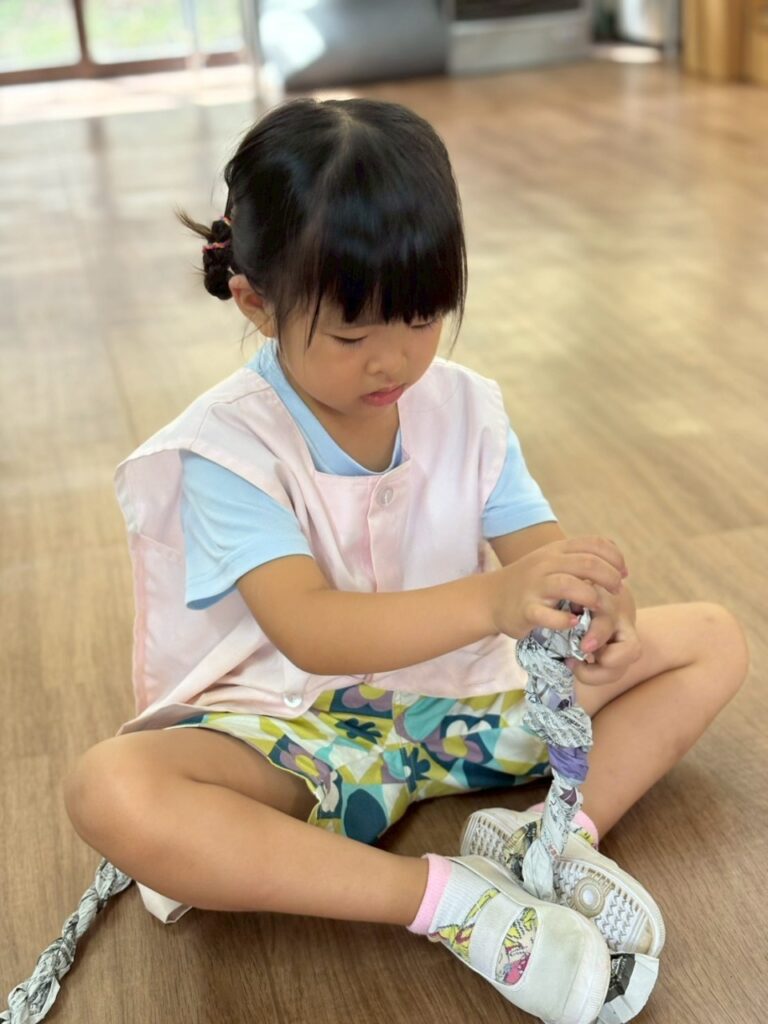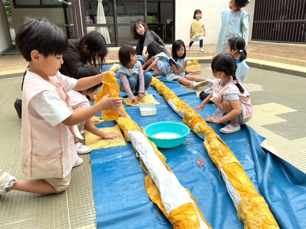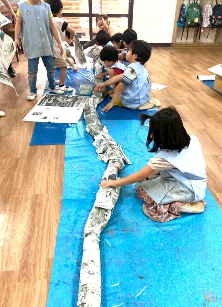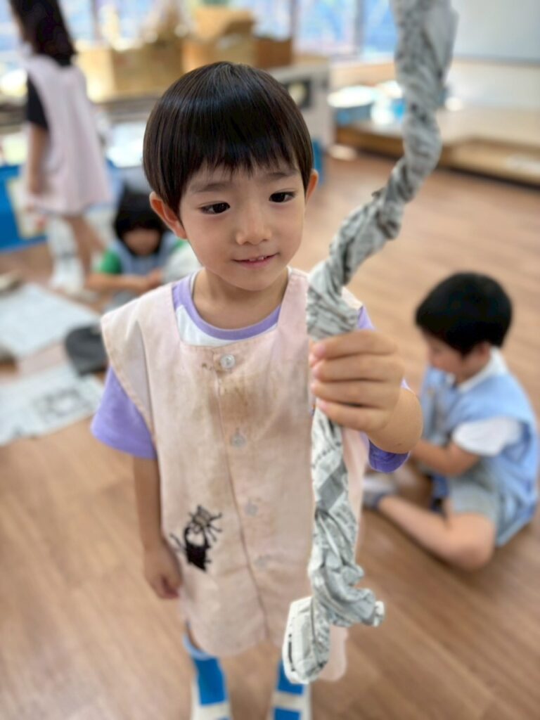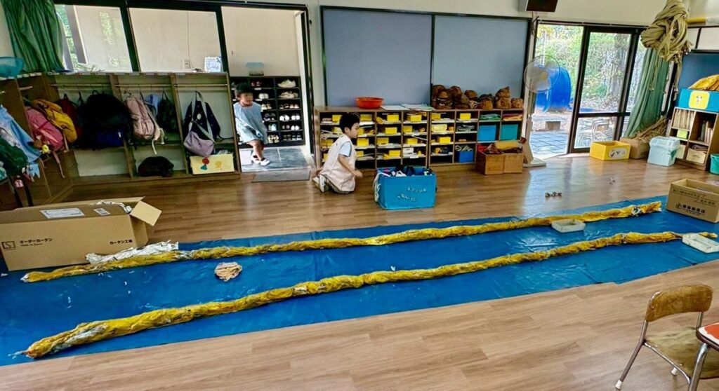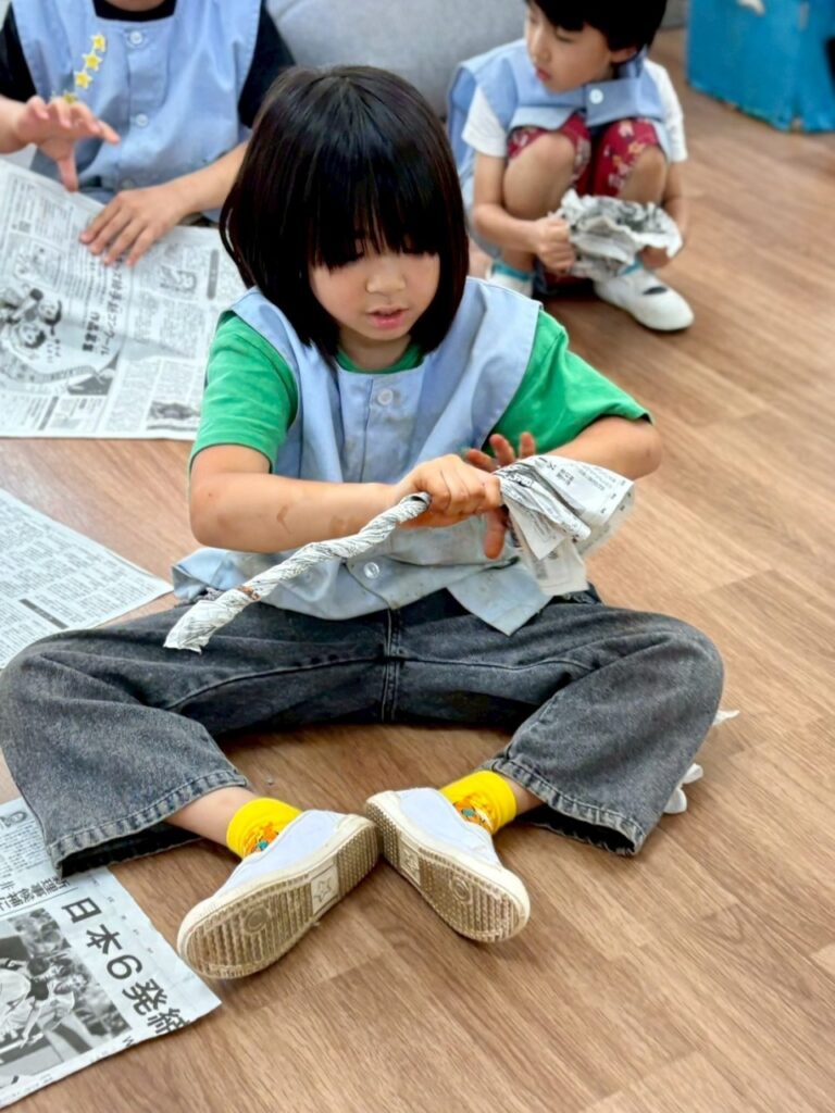 「かみだとちぎれてしまうかも・・・」と少しドキドキしながら なった新聞紙の縄は、想像以上に強く、子どもたちの表情は再び輝きだしました。