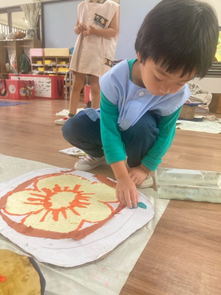絵を描くことが好きな方が下絵を描き、はさみで切るのが好きな方が大きな丸を切ったり・・・と、みんなで力を合わせながら、はたがしらを作る生活が始まりました!
