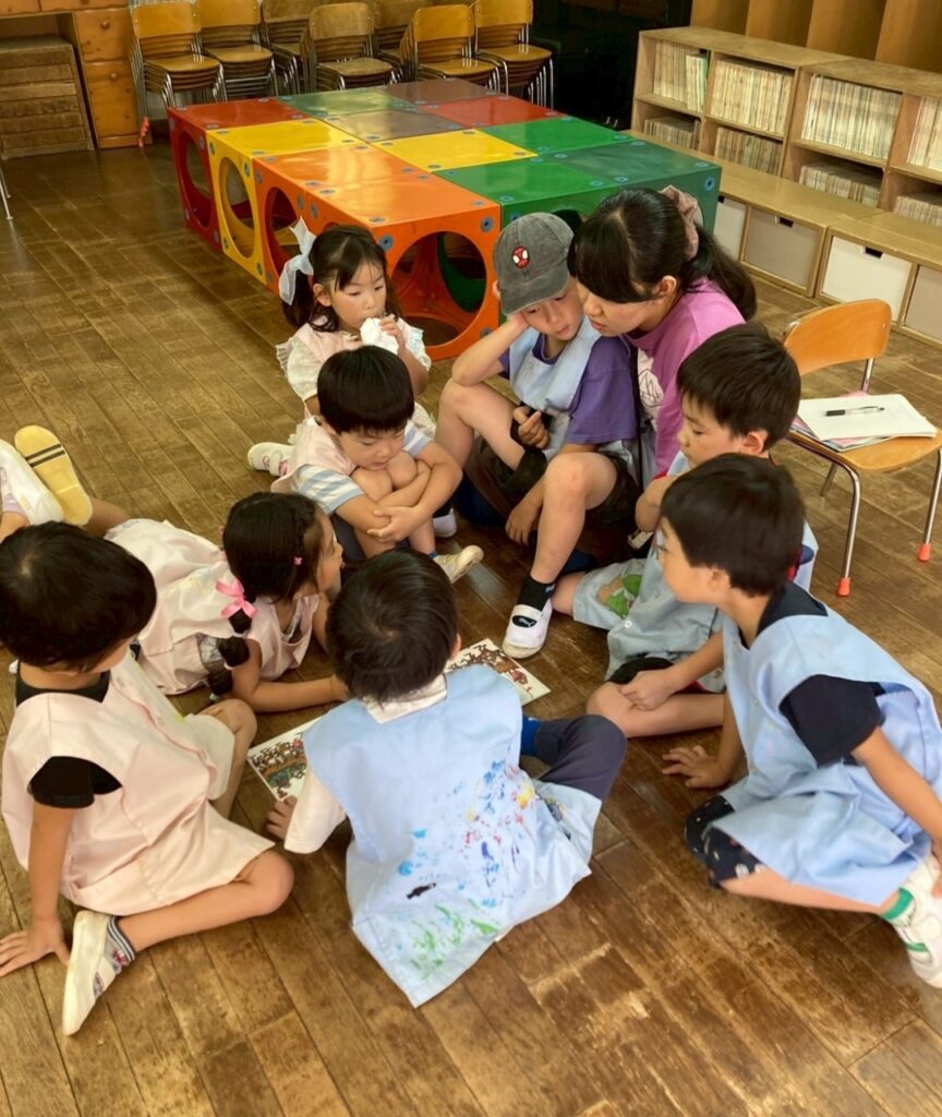 他のかえるのなかまに比べて人数が少ないのですが、だからこそ、ぎゅっと輪になり、みんなで1冊の絵本を覗き込みながら、かえるのつなひきの世界を膨らませています。
