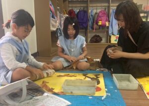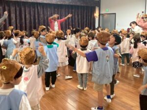 ある日のことーーー。 三線奏者の宮里英克さんを幼稚園にお招きして、沖縄の楽器やカチャーシー(踊り)について教えて頂きました。 「わあ!ほらがい だ!」「どんなおとが するんだろう・・・?」 「たいこだ~!」「いいおとが […]