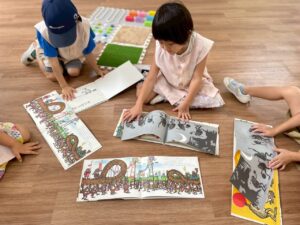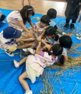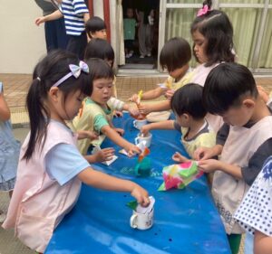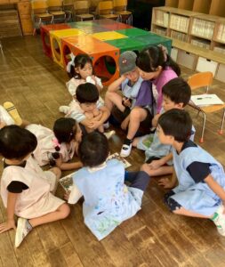 「はたがしらを つくりたいから!」「ぼくは、おおきい はたがしらを もつんだ~!」 「ほらがい(ほら貝)も ふいてみたいんだ!」 ・・・と、それぞれ『かえるのつなひき』の絵本を読む中で、はたがしらをつくるかえるに魅力を感 […]