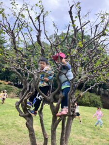 「今日は、てんきがいいから遠足に行こう!」お天気のいい日や、その日の様子でお弁当を持って、「遠足」に出かけます。行事として取り立ててする遠足ではなく、言葉通り、自分の足で歩く「遠足」です。四季折々の自然を感じながら、なかまと歩く<小さな遠足>を重ねることで、歩く力、丈夫な身体を作ります。しみます。