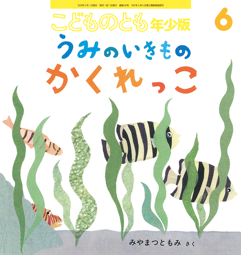 岩のすきまにいる カニ、砂の下にいる カレイ、海藻のもりの中にいる タツノオトシゴを次々と見つけて楽しんだ絵本です。